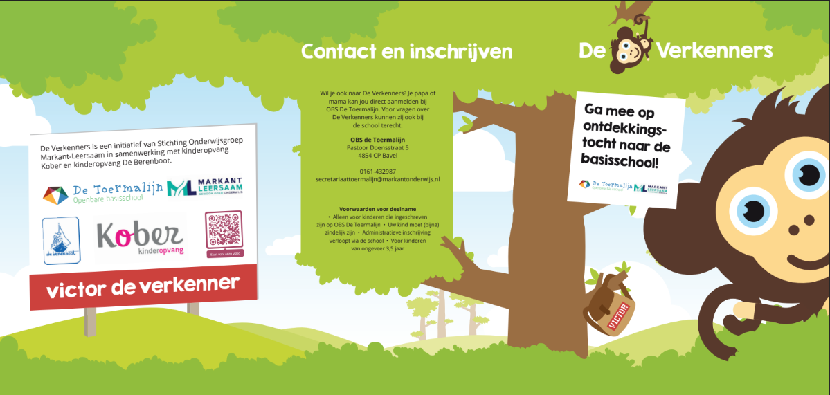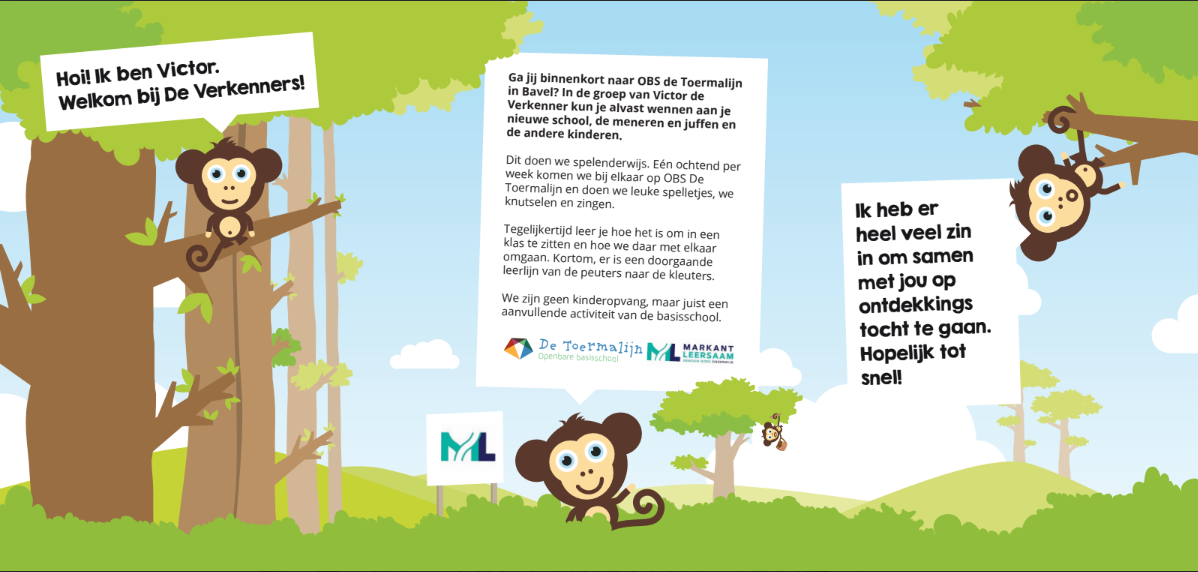 Victor de Verkenner is een leergierig en speels aapje dat de kinderen meeneemt in de nieuwe wereld van de basisschool. De peuters van Victor de Verkenner maken spelenderwijs kennis met de leerkrachten en klasgenootjes van onze school. We doen samen leuke spelletjes, we knutselen en zingen. Ook mogen de peuters lekker ravotten in de speelzaal of op het speelplein. Uiteraard gaan we óók op bezoek in groep 1-2 en werken dan samen met de kleuters in de klas. Tegelijkertijd leren de peuters dan hoe het is om in een klas te zitten en hoe we in de klas met elkaar omgaan. Zo leert uw kind al zijn/haar toekomstige leerkrachten en klasgenootjes kennen.